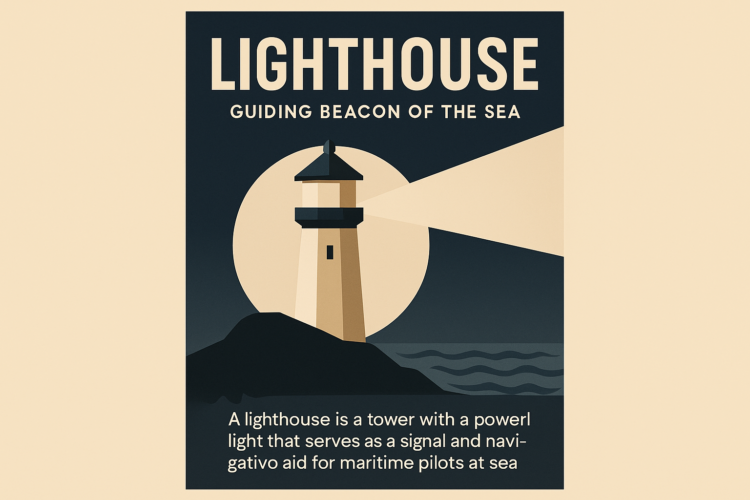 This image features a stylized lighthouse, showcasing its role as a guiding light for maritime navigation. The design incorporates a three-color scheme and layered composition for visual appeal.