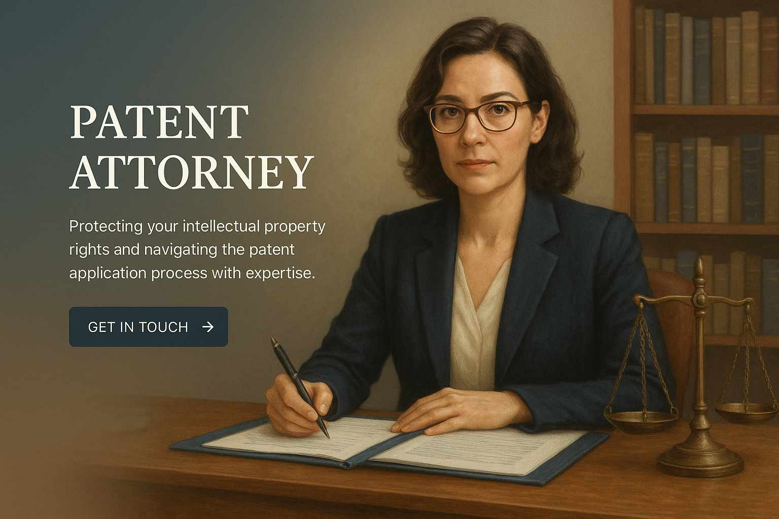 A sophisticated web page layout for a patent attorney, featuring a realistic illustration, a small label, a concise headline, and an action button with an icon.