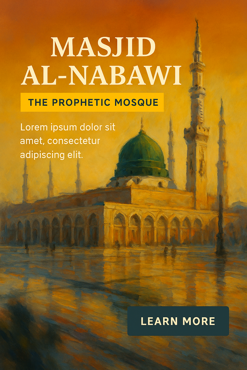 /Collection: /by davooda/Type: PNG/This image features a stylized painting of Masjid Al-Nabawi, showcasing its iconic dome and minarets against a sunset. It's designed for promotional use, likely for educational or tourism purposes.