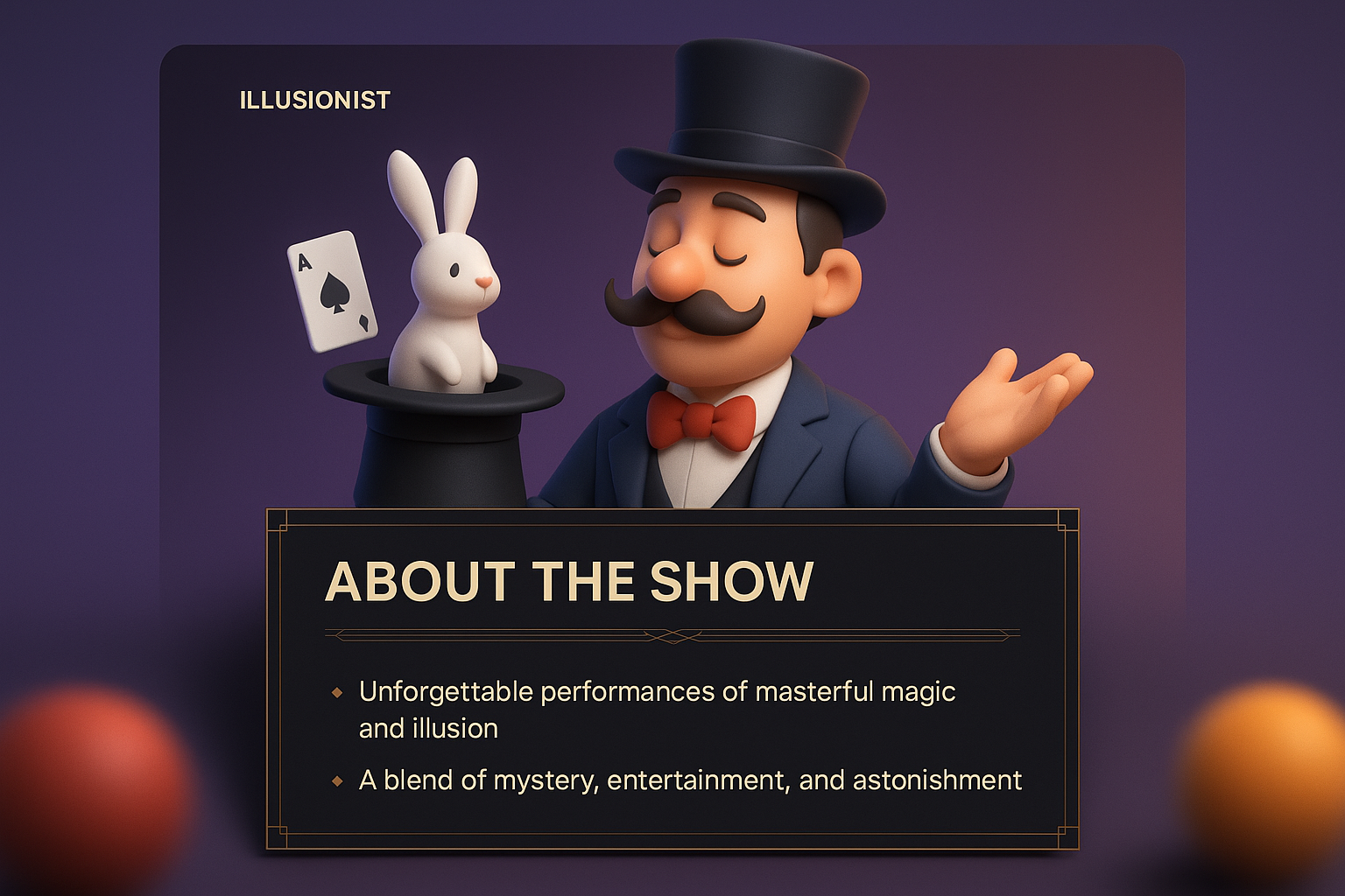 /Collection: /by davooda/Type: PNG/A captivating 3D illustration featuring an illusionist with a rabbit and card, complemented by a dark info block. The design integrates seamlessly into the scene, highlighting the theme of magic.