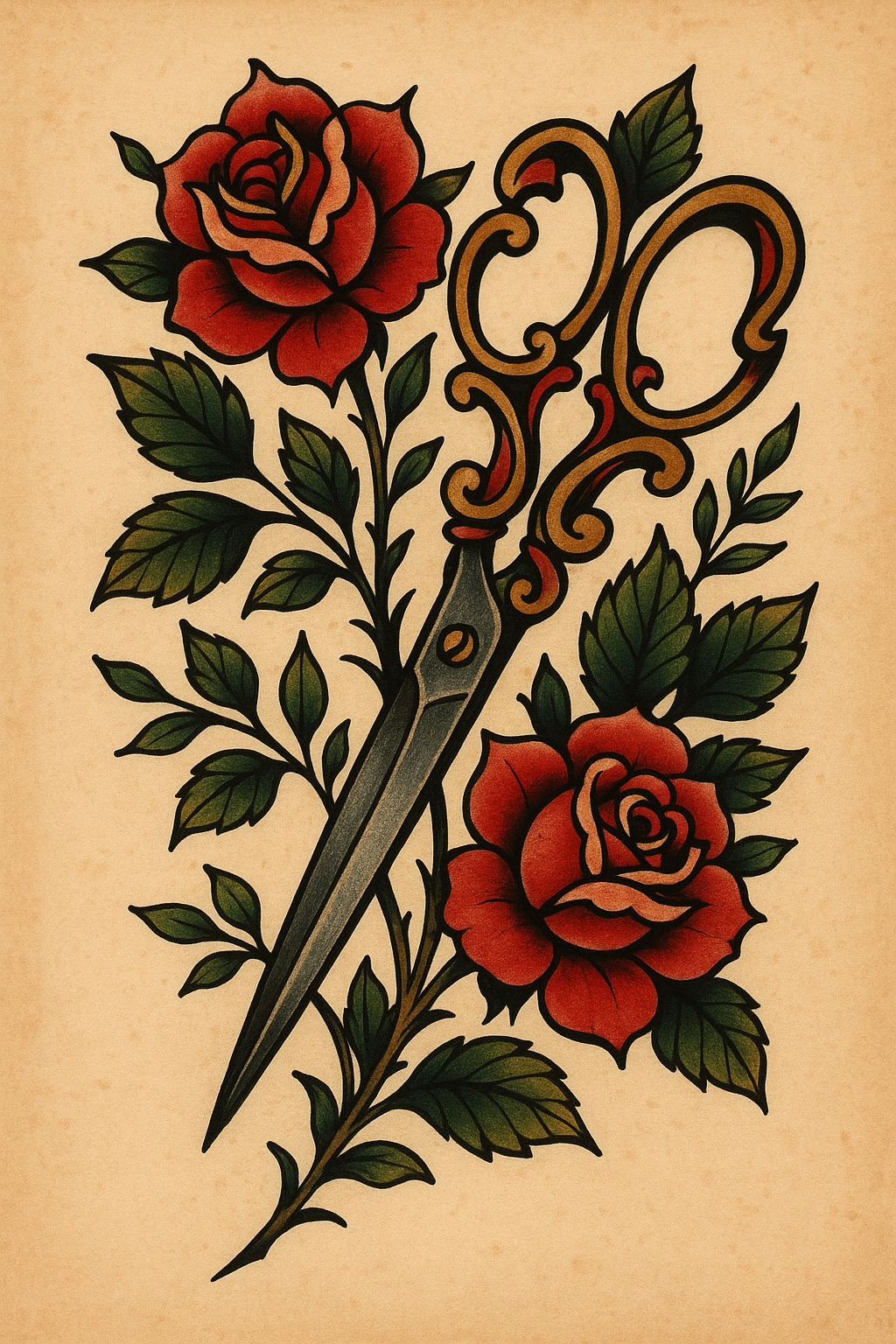 /Collection: /by davooda/Type: PNG/This image features a vintage-style illustration combining roses and ornate scissors, ideal for tattoo design or artistic decor. The bold colors and intricate details appeal to art enthusiasts.