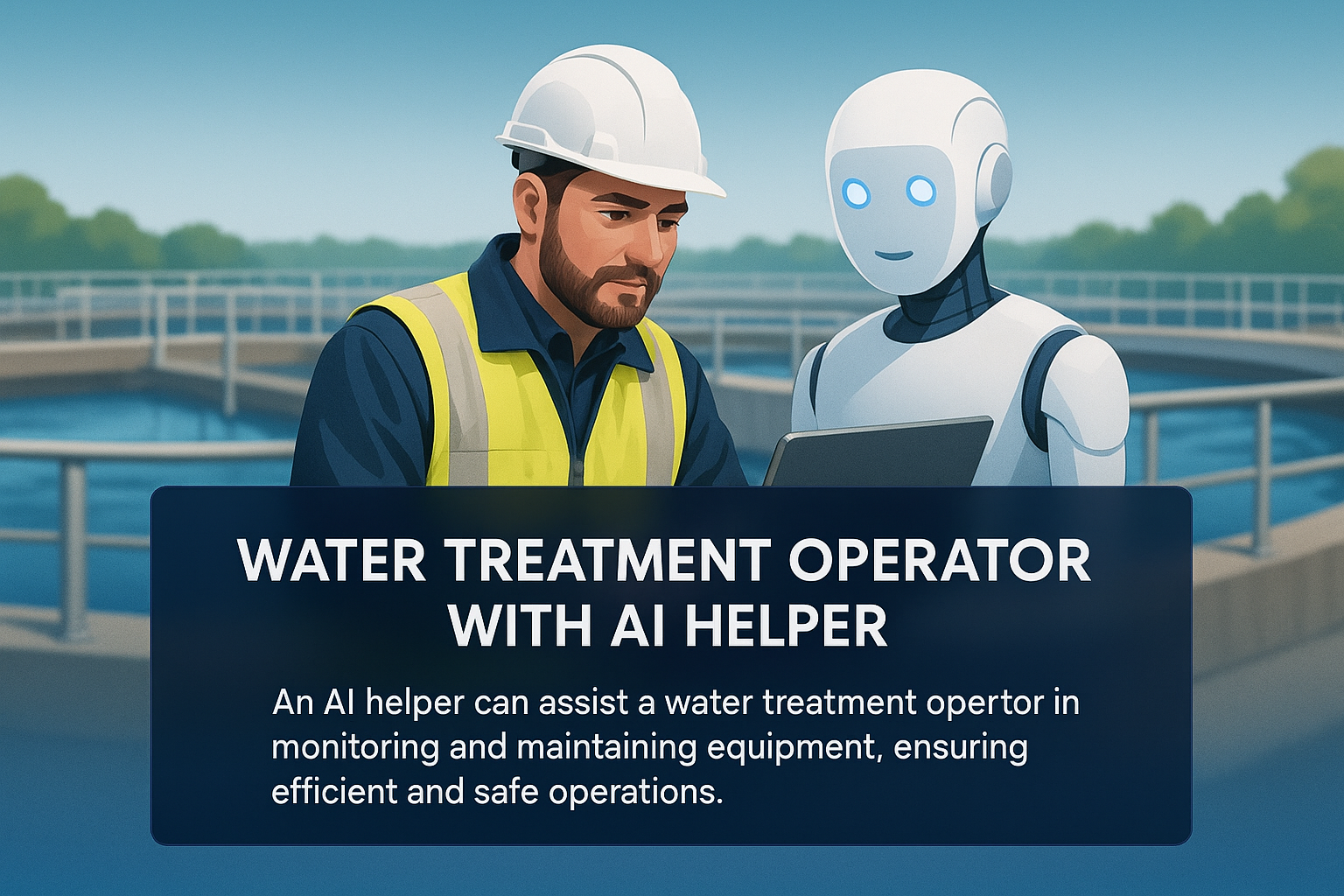 /Collection: /by davooda/Type: PNG/A water treatment operator in a safety helmet works alongside an AI helper, showcasing technology in water management. The scene emphasizes efficiency and safety in operations.