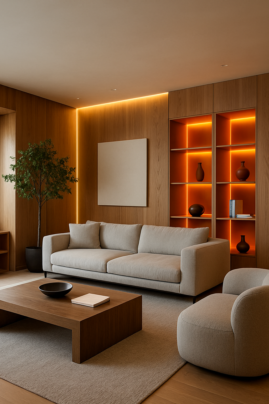 A sleek, modern living room featuring a soft beige sofa and a wooden coffee table. The space is enhanced by warm accent lighting and minimal decor, creating a cozy atmosphere.