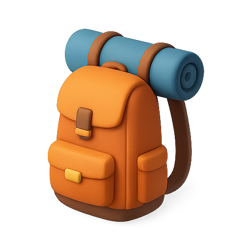 A colorful 3D rendered backpack featuring an orange design with a blue rolled sleeping bag attached. Ideal for outdoor and travel-related content.