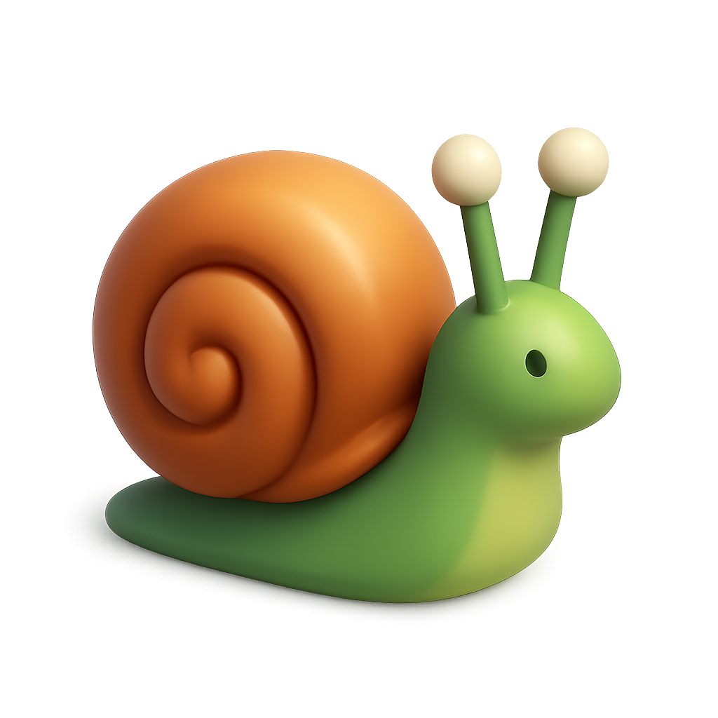 A vibrant 3D snail icon featuring a green body and an orange spiral shell, designed in a three-quarter isometric view with a glossy finish and soft lighting.