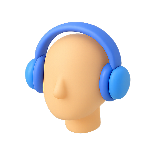 A minimalist 3D illustration of a head wearing vibrant blue headphones, ideal for music-related content, product showcases, or digital art.
