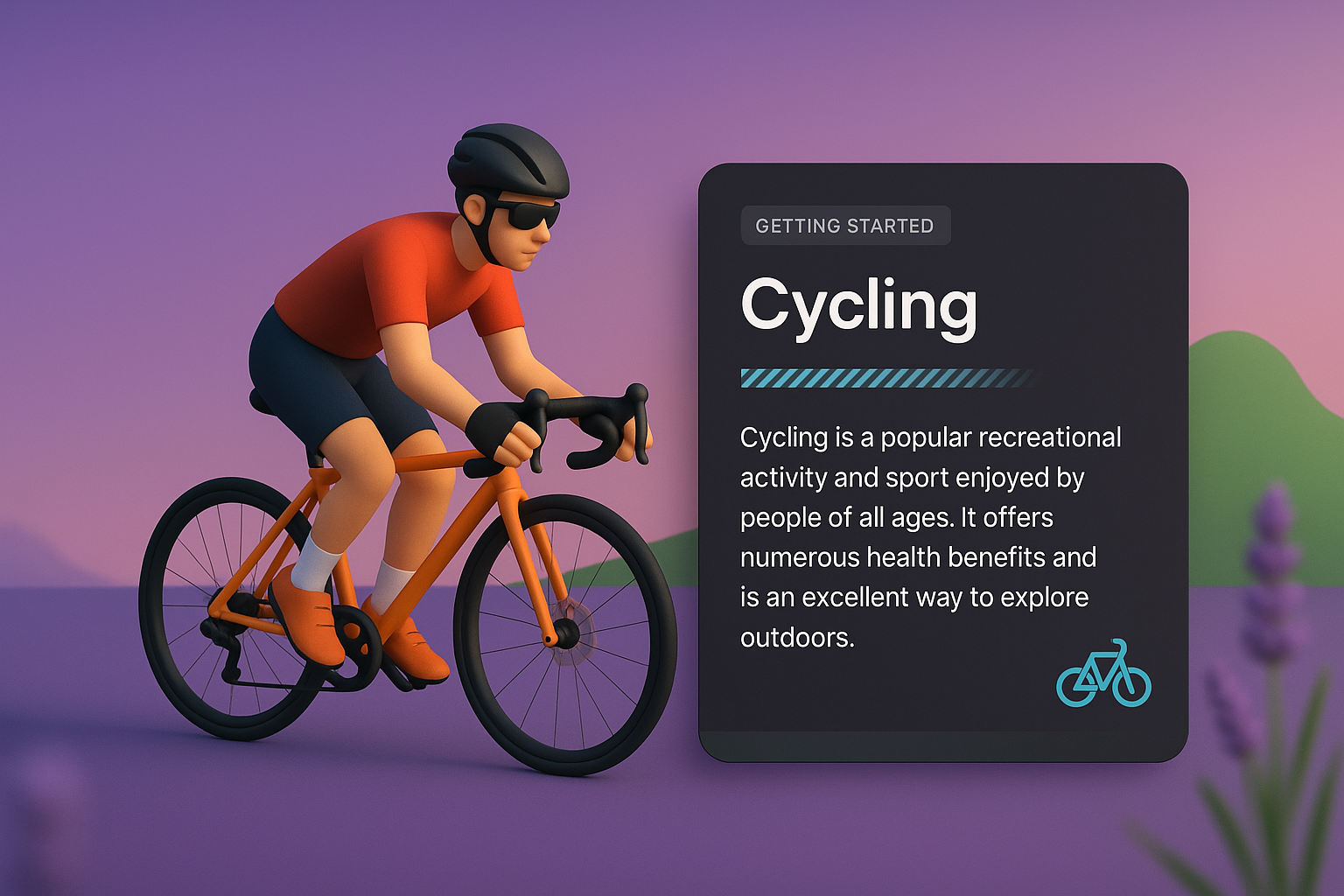 A vibrant 3D illustration of a cyclist in action, set against a gradient background. The design features an integrated information block detailing the benefits of cycling.