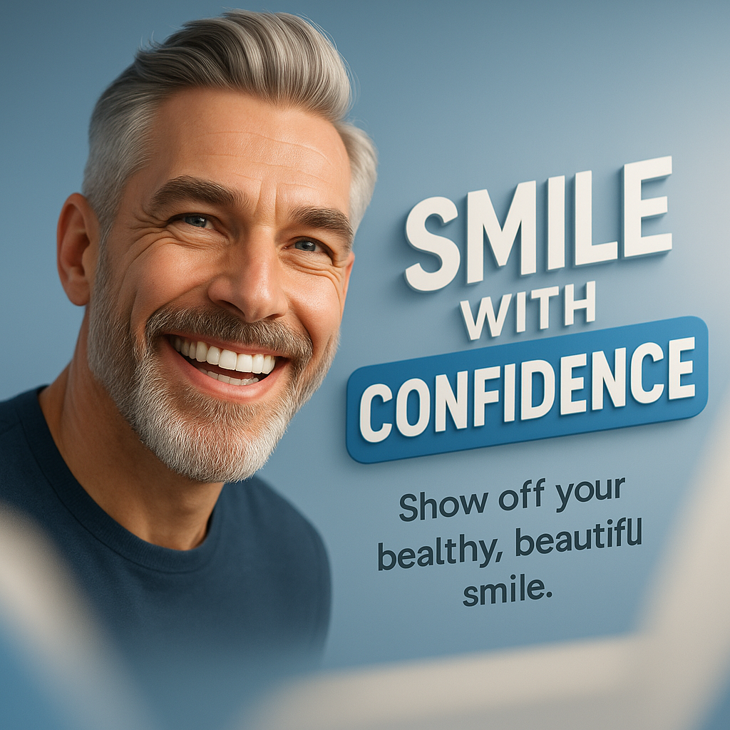 /Collection: /by davooda/Type: PNG/A vibrant promotional graphic featuring a smiling man, designed to boost confidence and promote dental health. Ideal for dental clinics and wellness campaigns.
