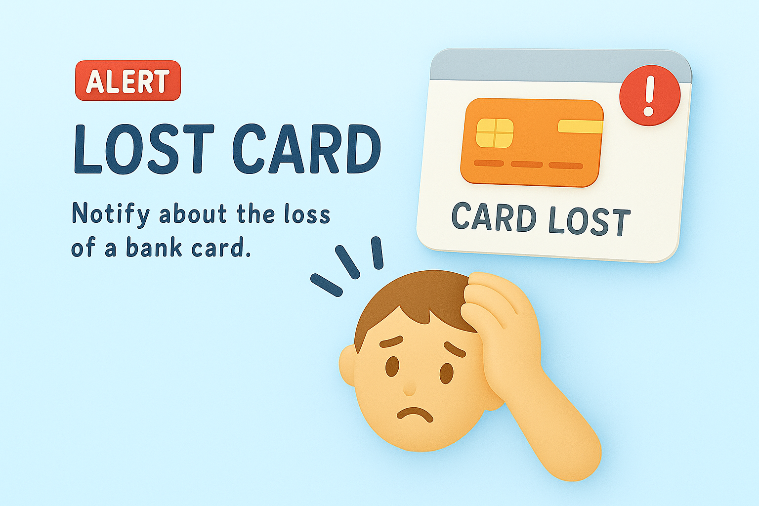 /Collection: /by davooda/Type: PNG/A visually engaging graphic illustrating a lost bank card notification. Featuring a worried character and a card image, it's suitable for digital banking alerts or financial service communications.