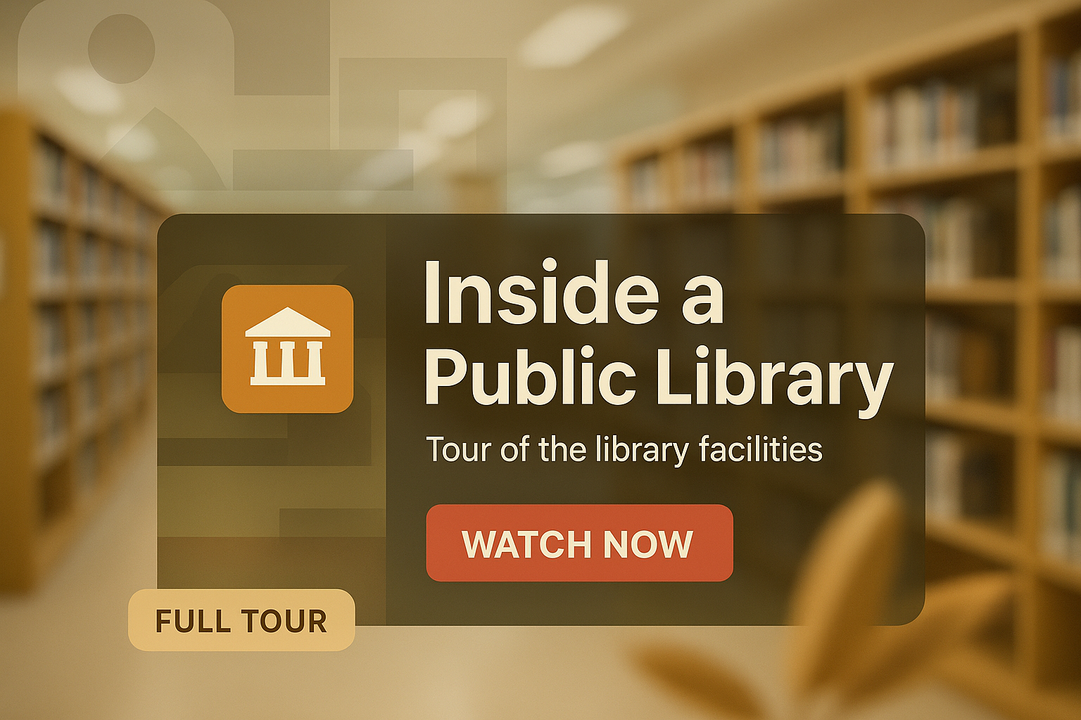 Promotional graphic designed for a virtual tour of a public library, featuring a modern layout with clear call-to-action elements and a warm color palette.