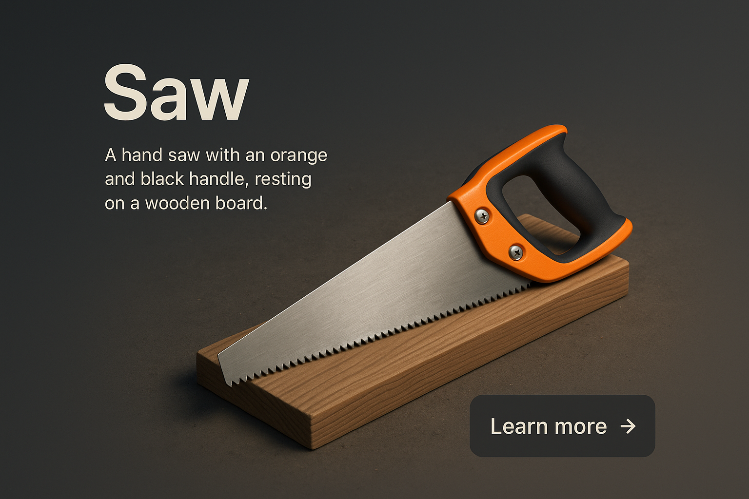 A detailed 3D illustration of a hand saw with an orange and black handle resting on a wooden board. The background features a smooth gradient, creating a realistic setting.