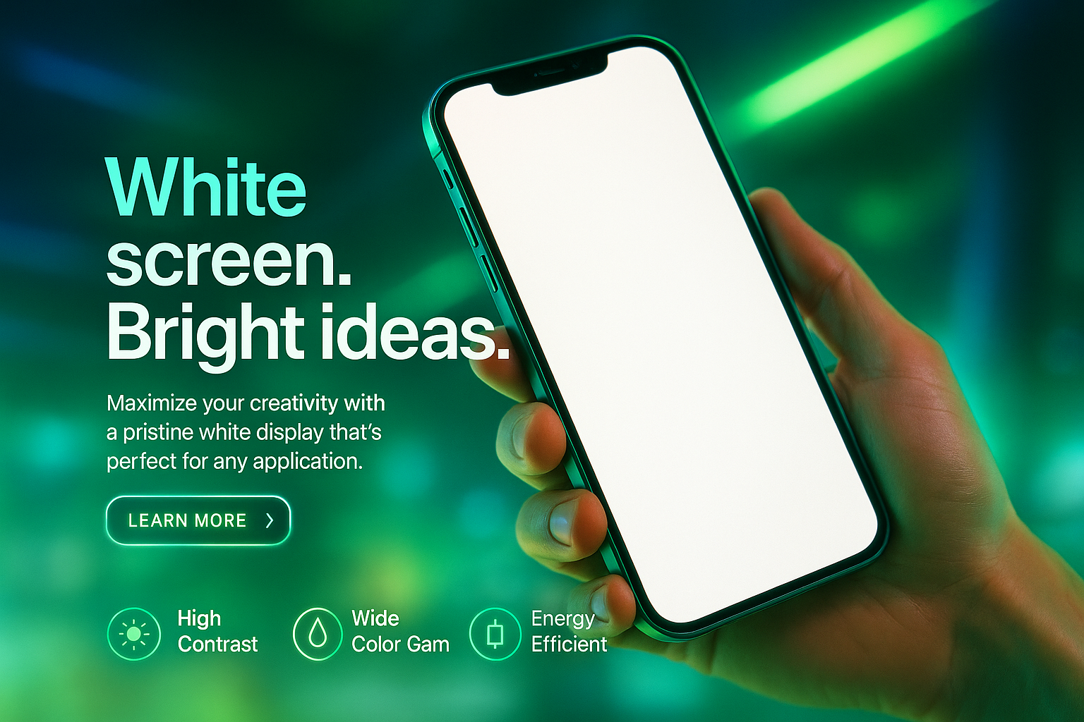 /Collection: /by davooda/Type: PNG/A vibrant display featuring a hand holding a smartphone with a white screen. The background showcases neon accents and a gradient, emphasizing creativity and modernity.