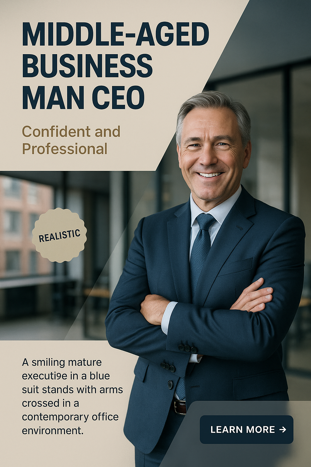 /Collection: /by davooda/Type: PNG/A smiling middle-aged CEO stands confidently in a contemporary office, arms crossed, wearing a blue suit. The composition features a balanced design with clear text and engaging visual elements.