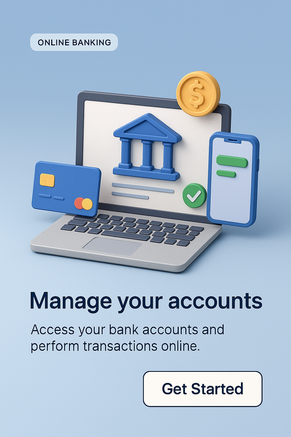 A realistic 3D illustration depicting online banking. Elements include a laptop, bank icon, credit card, and phone, all emphasizing account management.