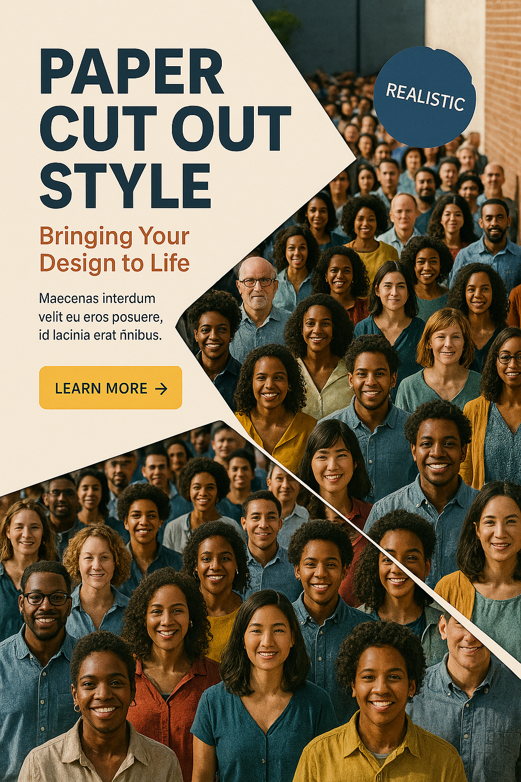 A large crowd of diverse individuals captured in a paper cut out style. The image features a structured design with a clear hierarchy, showcasing realism and balanced composition.