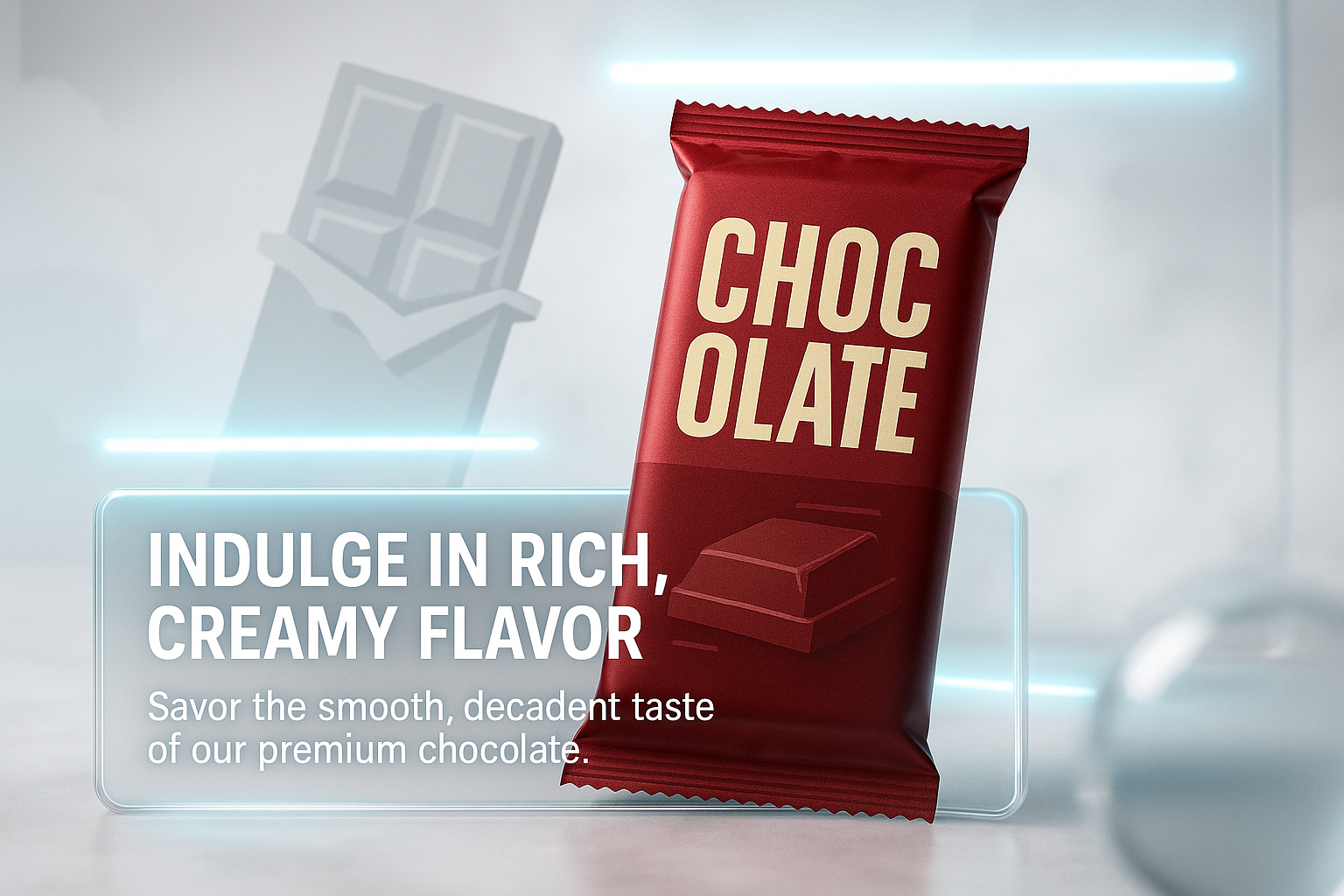 A visually appealing product mockup showcasing a chocolate bar with a rich design and enticing text, ideal for marketing premium chocolate products.