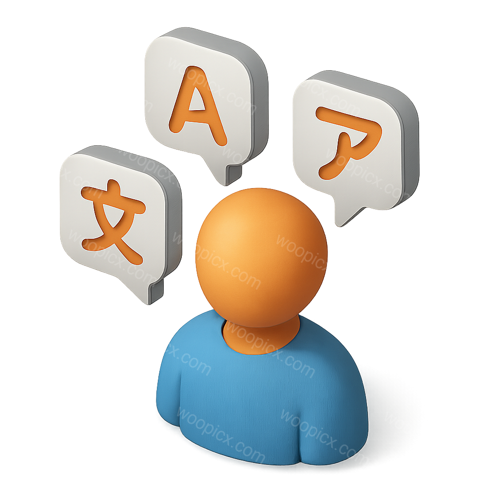 /Premium/Collection: /by davooda/Type: PNG/A stylized 3D icon depicting a person with an orange head and blue torso, surrounded by speech bubbles featuring different language symbols, set against a soft gradient background.