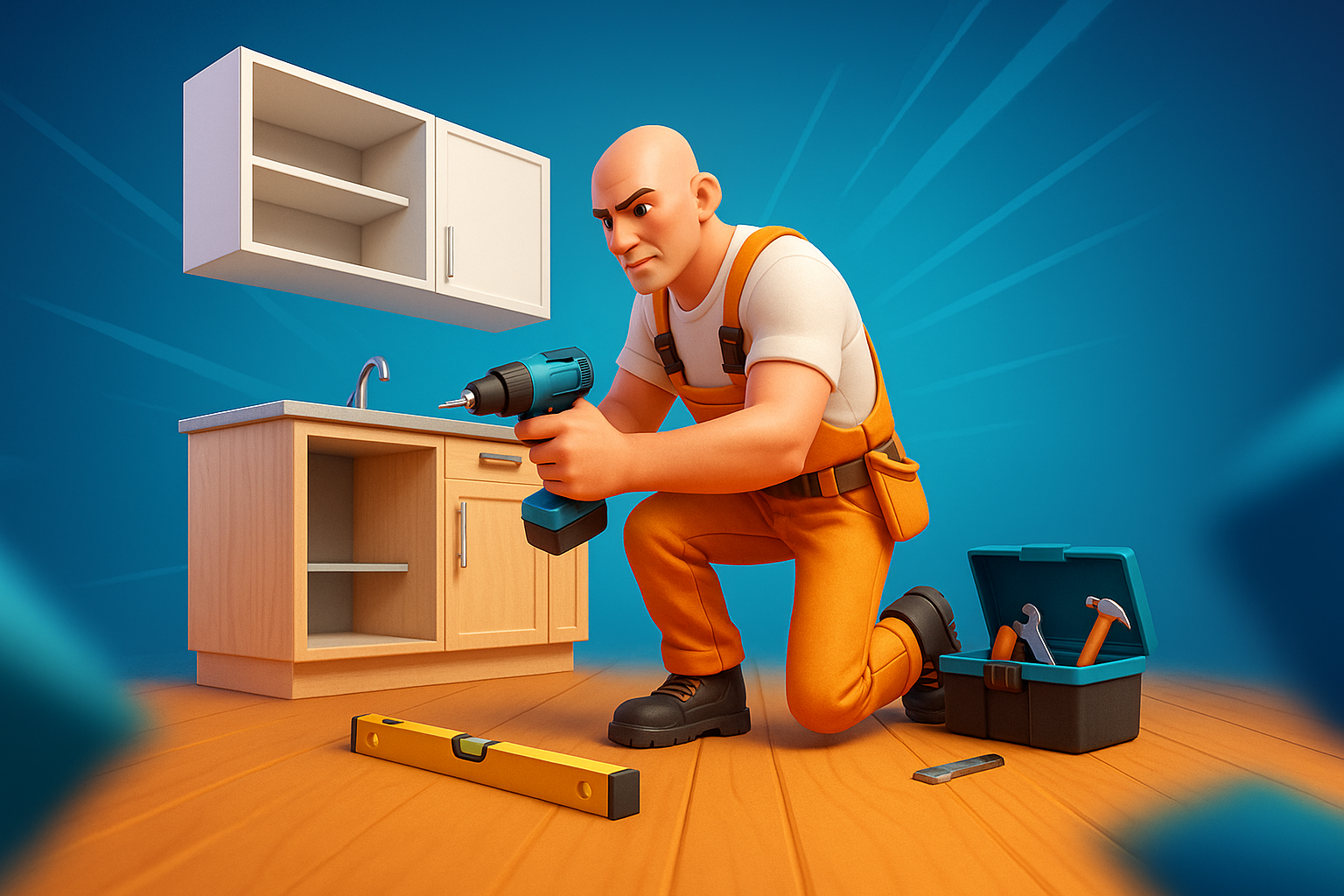 A 3D illustration of a worker preparing a kitchen for customization. The scene features a determined character using a drill, with tools nearby and a gradient background enhancing the dynamic feel.