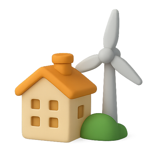 Playful 3D graphic featuring a stylized house alongside a wind turbine, symbolizing sustainable living and renewable energy. Ideal for eco-friendly campaigns.