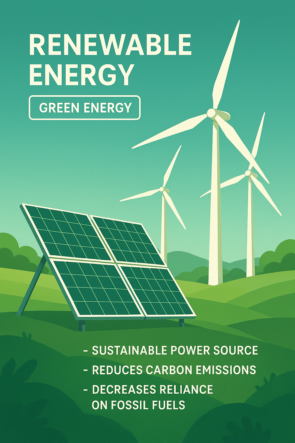 /Collection: /by davooda/Type: PNG/A vibrant graphic depicting renewable energy sources, featuring solar panels and wind turbines against a green landscape. Ideal for educational materials or environmental awareness campaigns.