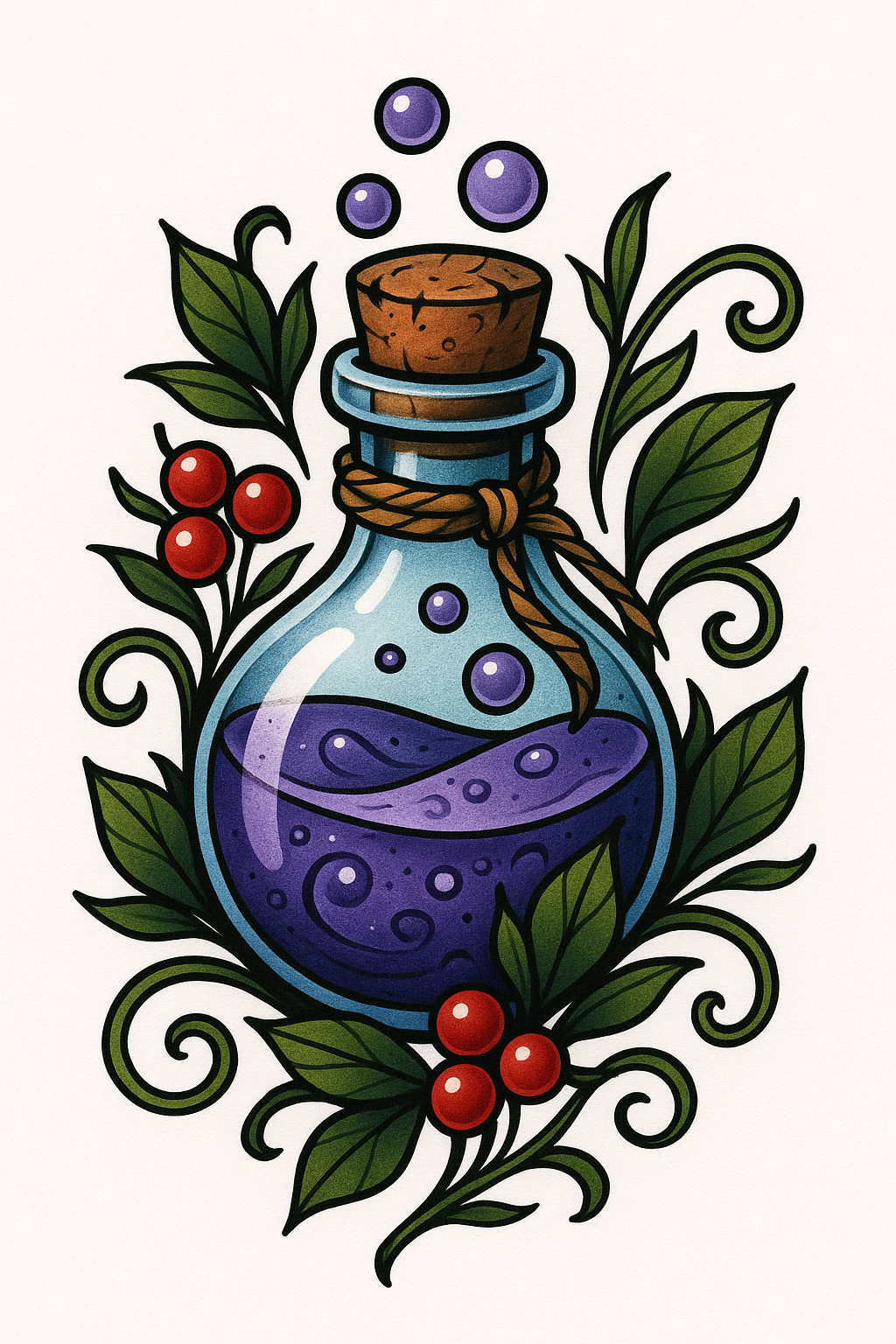 Vibrant illustration of a potion bottle surrounded by leaves and berries, suitable for fantasy-themed projects, merchandise, or decor.
