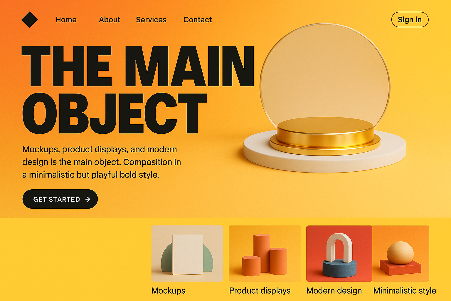 A luxurious 3D golden podium on a white platform against a vibrant background. Features oversized text and playful elements, creating a modern and minimalistic design.