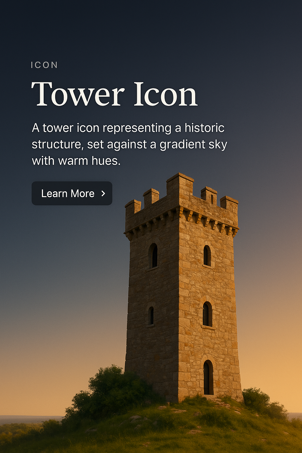 A visually striking tower icon set against a gradient sky, showcasing warm hues. The design includes a small label, a concise title, and a call-to-action button.