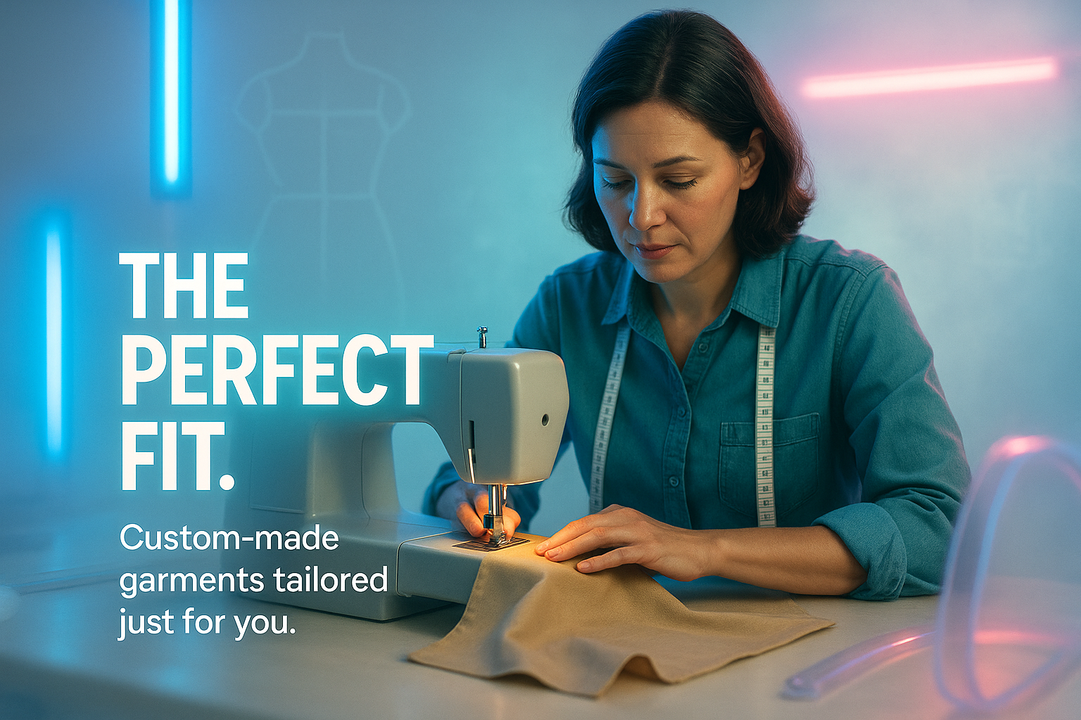 A promotional image showcasing a woman sewing, highlighting custom-made garments with modern lighting, ideal for fashion brands or tailoring services.