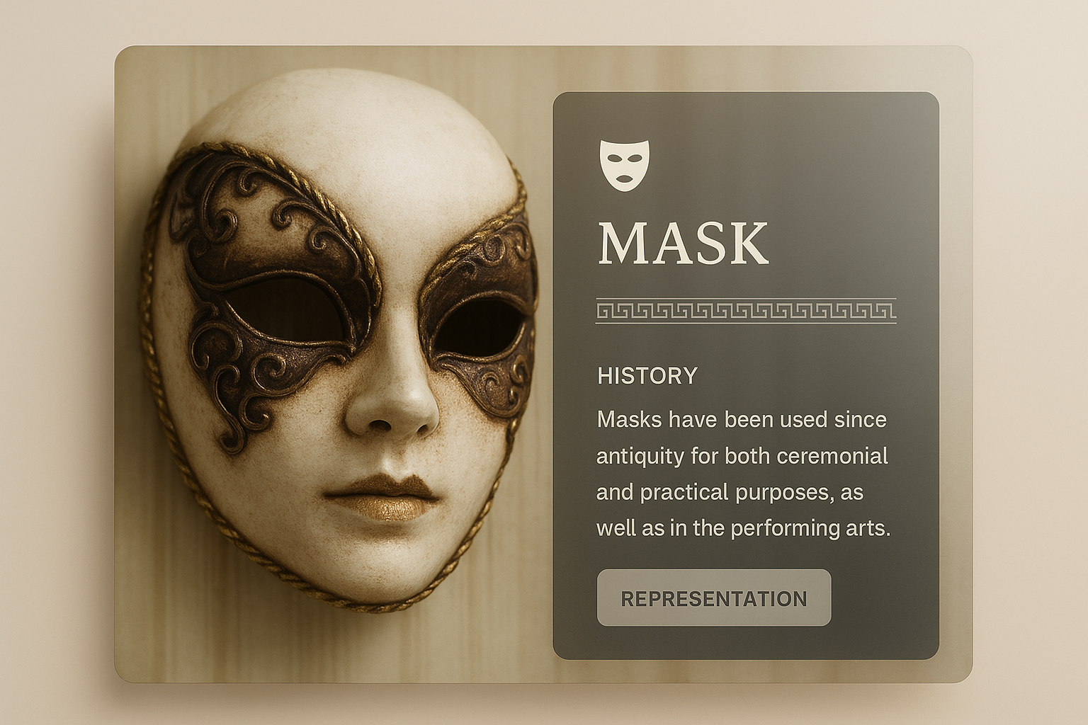 /Collection: /by davooda/Type: PNG/A beautifully designed web layout featuring a mask illustration. The layout includes textual elements on a semi-transparent panel, integrating modern aesthetics with a historical theme.