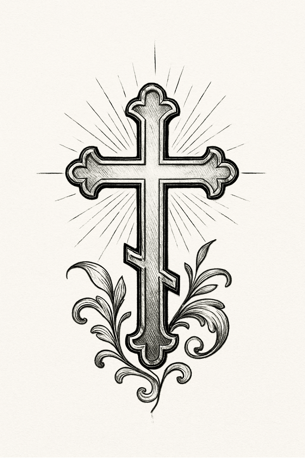 This is a detailed illustration of a cross, featuring elegant floral motifs and radiating lines. Ideal for religious or artistic use.