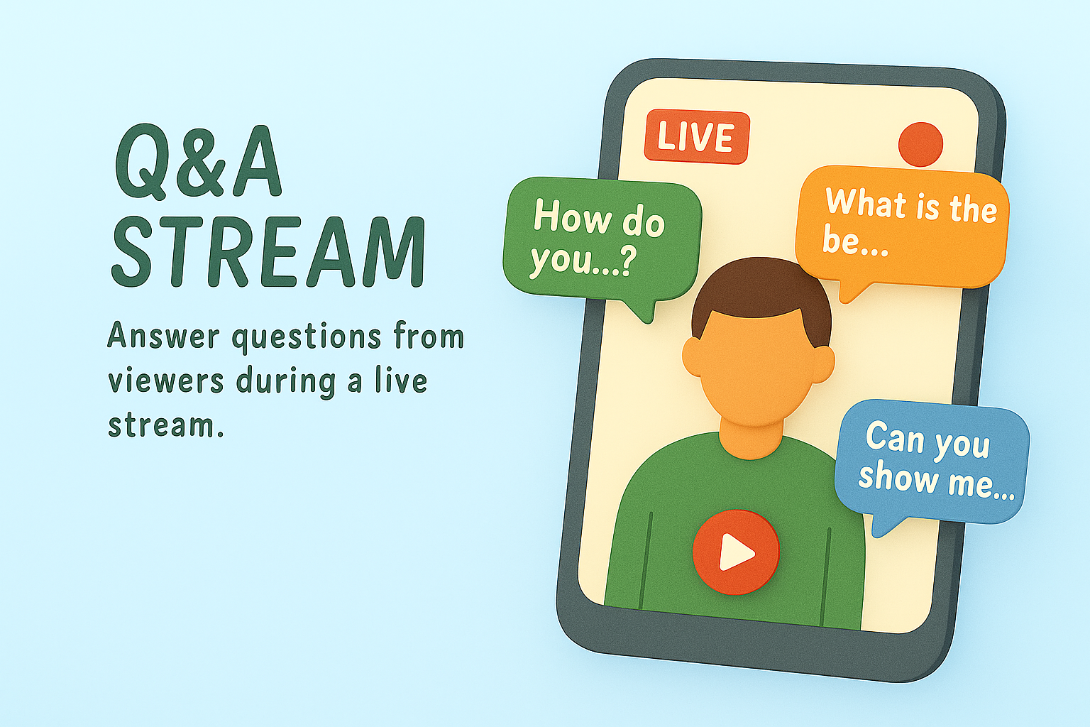 Engaging graphic representing a Q&A stream concept, featuring a smartphone with speech bubbles. Ideal for promoting live interaction during broadcasts.