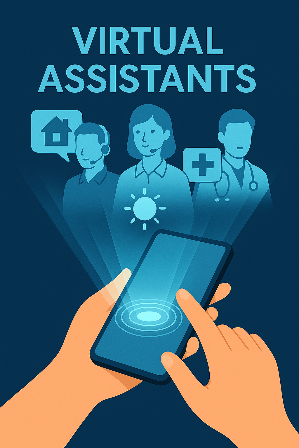 /Collection: /by davooda/Type: PNG/Vector illustration depicting virtual assistants with a smartphone interface, highlighting their roles. The design features modern graphic elements suitable for tech-related content.