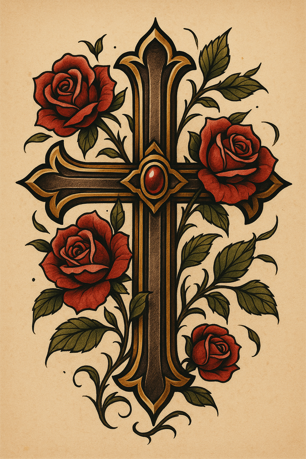 This image features a beautifully detailed cross entwined with roses, showcasing a vintage tattoo art style. It is ideal for religious or decorative purposes.