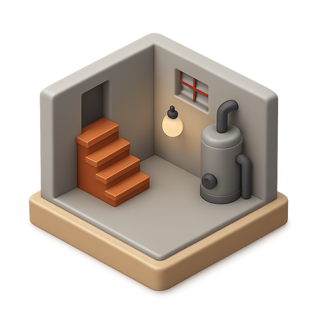 A stylized isometric 3D icon of a basement interior featuring wooden stairs, a window, a light fixture, and a cylindrical appliance, all set on a base.