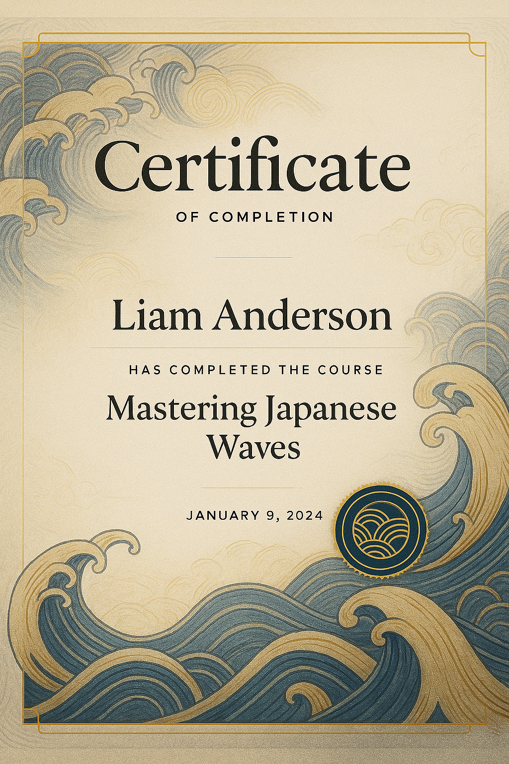Stylish certificate featuring a traditional wave design, suitable for course completions. Ideal for educational institutions or online courses.