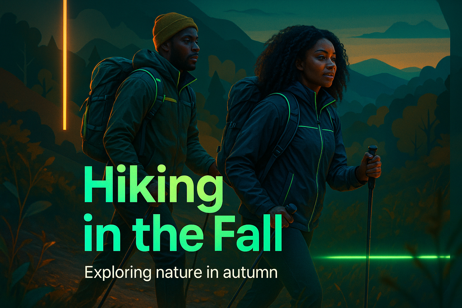 Vibrant promotional graphic showcasing two hikers in autumn scenery, ideal for outdoor activity campaigns and nature exploration events.