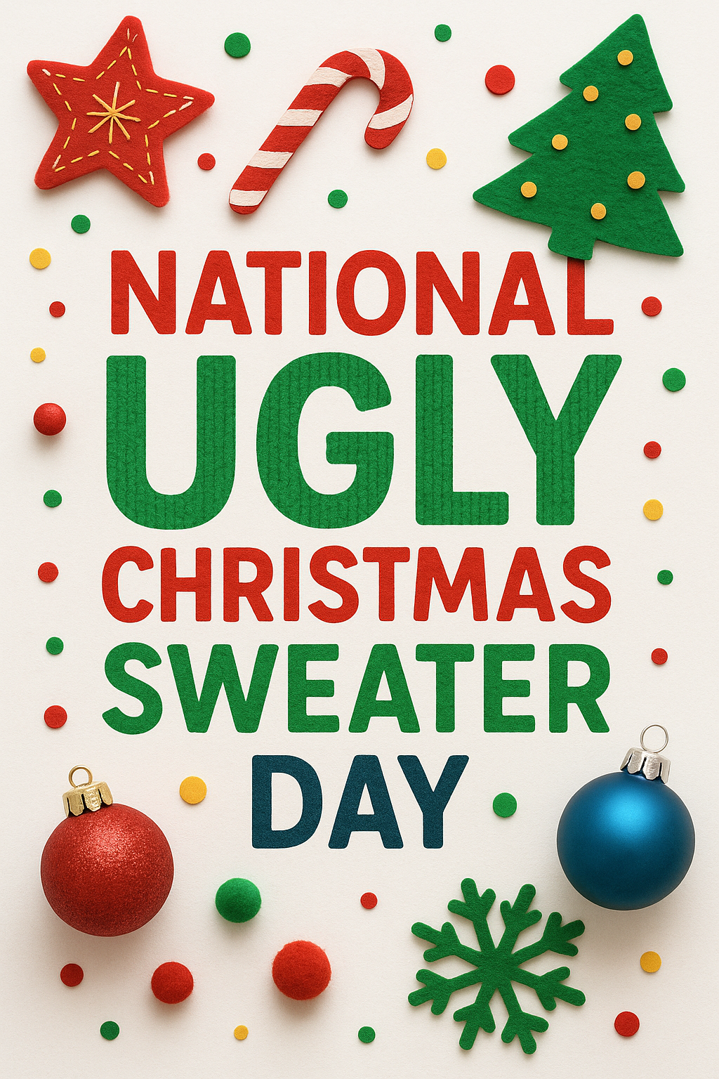 /Collection: /by davooda/Type: PNG/Colorful and playful promotional graphic celebrating National Ugly Christmas Sweater Day, featuring holiday-themed decorations and vibrant typography, ideal for social media and event marketing.