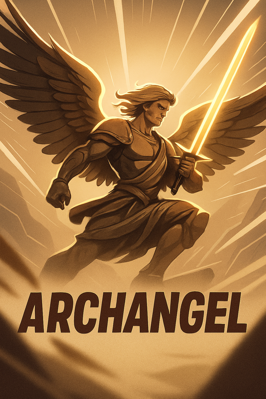 /Collection: /by davooda/Type: PNG/A striking illustration of an archangel wielding a sword, set against a gradient background. The figure is depicted with dynamic lines and a luminous halo effect, capturing a sense of movement.