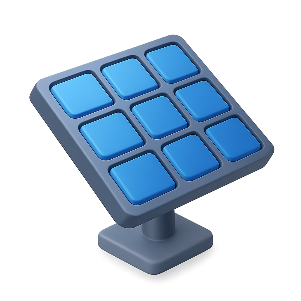A visually striking 3D icon of a solar panel array, presented in a three-quarter view with a modern isometric design. The panel features a grid of blue cells on a sleek gray base, showcasing a volumetric feel.