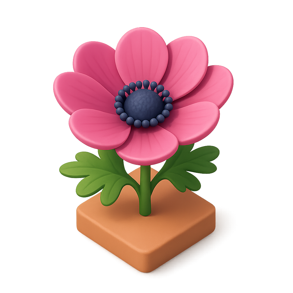 A colorful 3D icon of an anemone flower featuring vibrant pink petals, a dark center, and green leaves, presented on a square base with a transparent background.