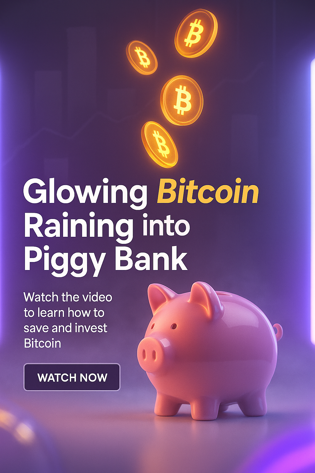 Vibrant digital illustration featuring a piggy bank with glowing Bitcoin symbols raining down. Ideal for investment and financial education promotions.