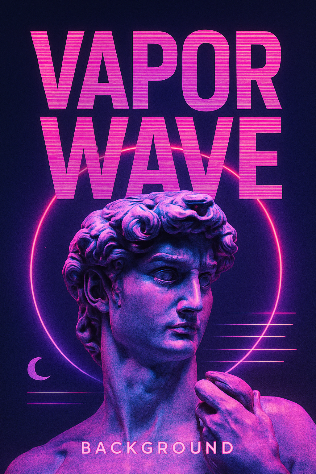 Stylized digital art background showcasing a classical statue in a vibrant vaporwave aesthetic. Ideal for use in graphic design projects, social media posts, and music covers.
