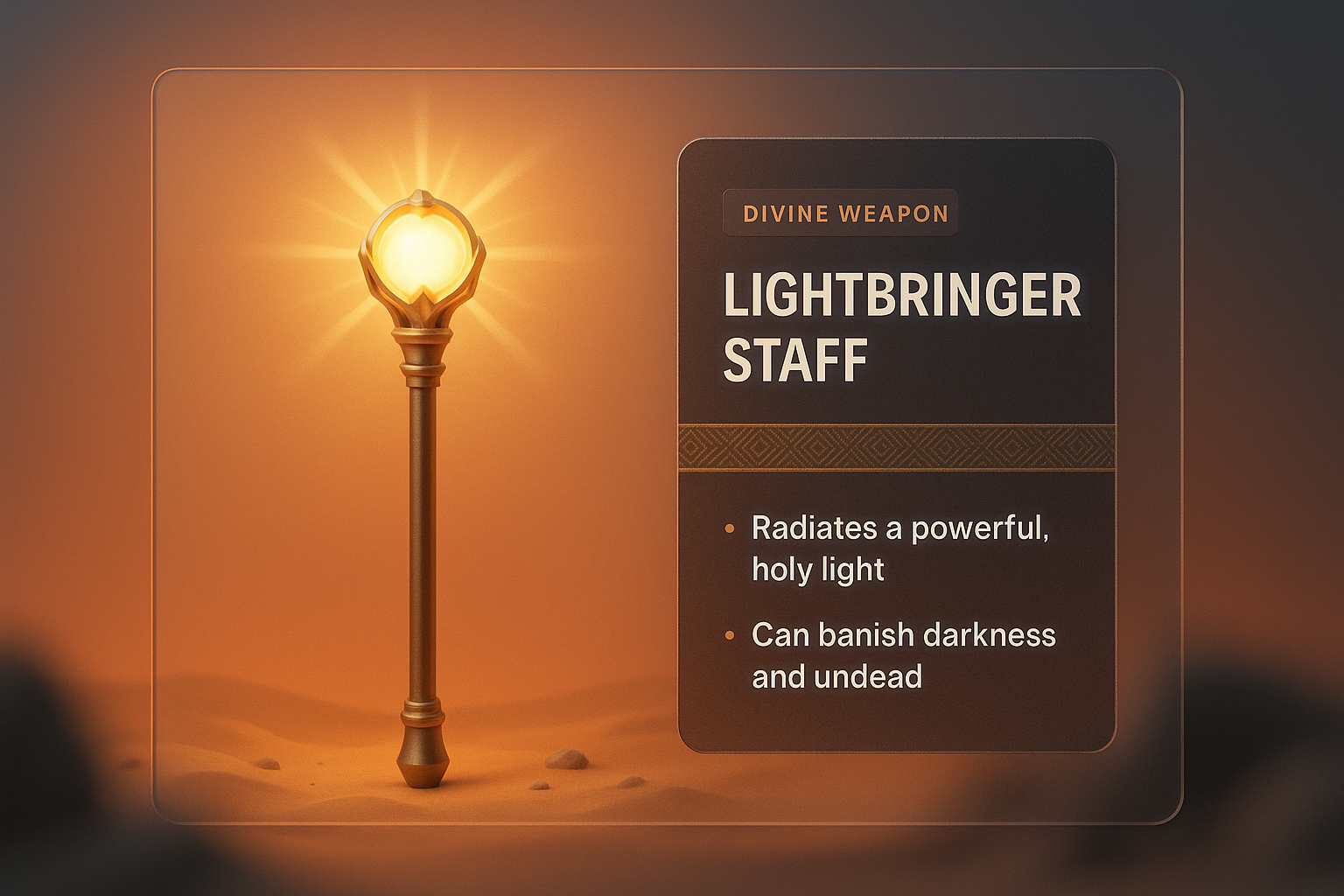 A visually striking 3D illustration of a Lightbringer staff, radiating a powerful light. The design includes a dark overlay with descriptive text, enhancing its mystique.