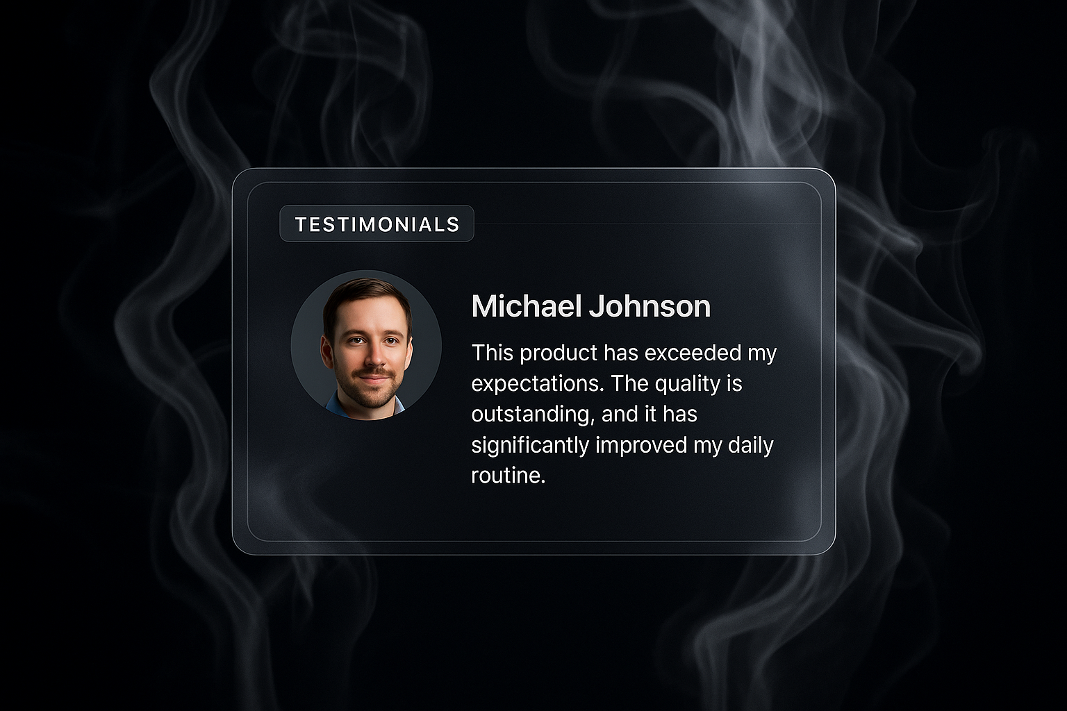 A testimonial card featuring a circular photo of a person named Michael Johnson, set against a dark background with flowing smoke elements. The text highlights a positive review, enhancing the mystical atmosphere.