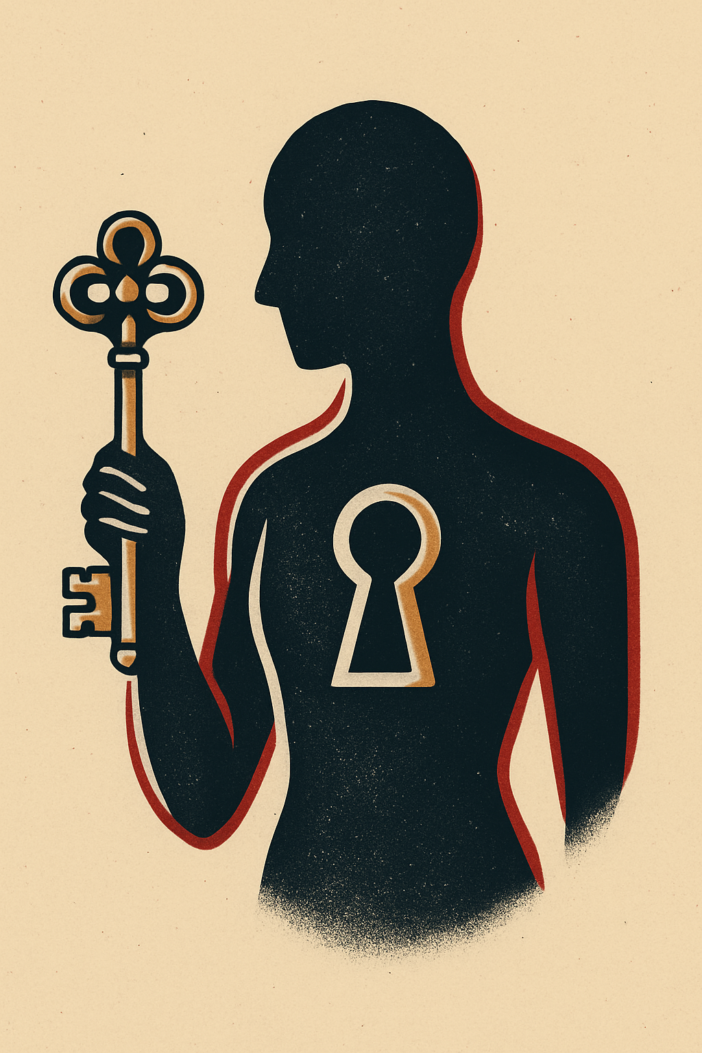 A stylized silhouette of a person holding a key, with a keyhole design on their chest. The artwork features a classic tattoo style in multiple colors against a light beige background.