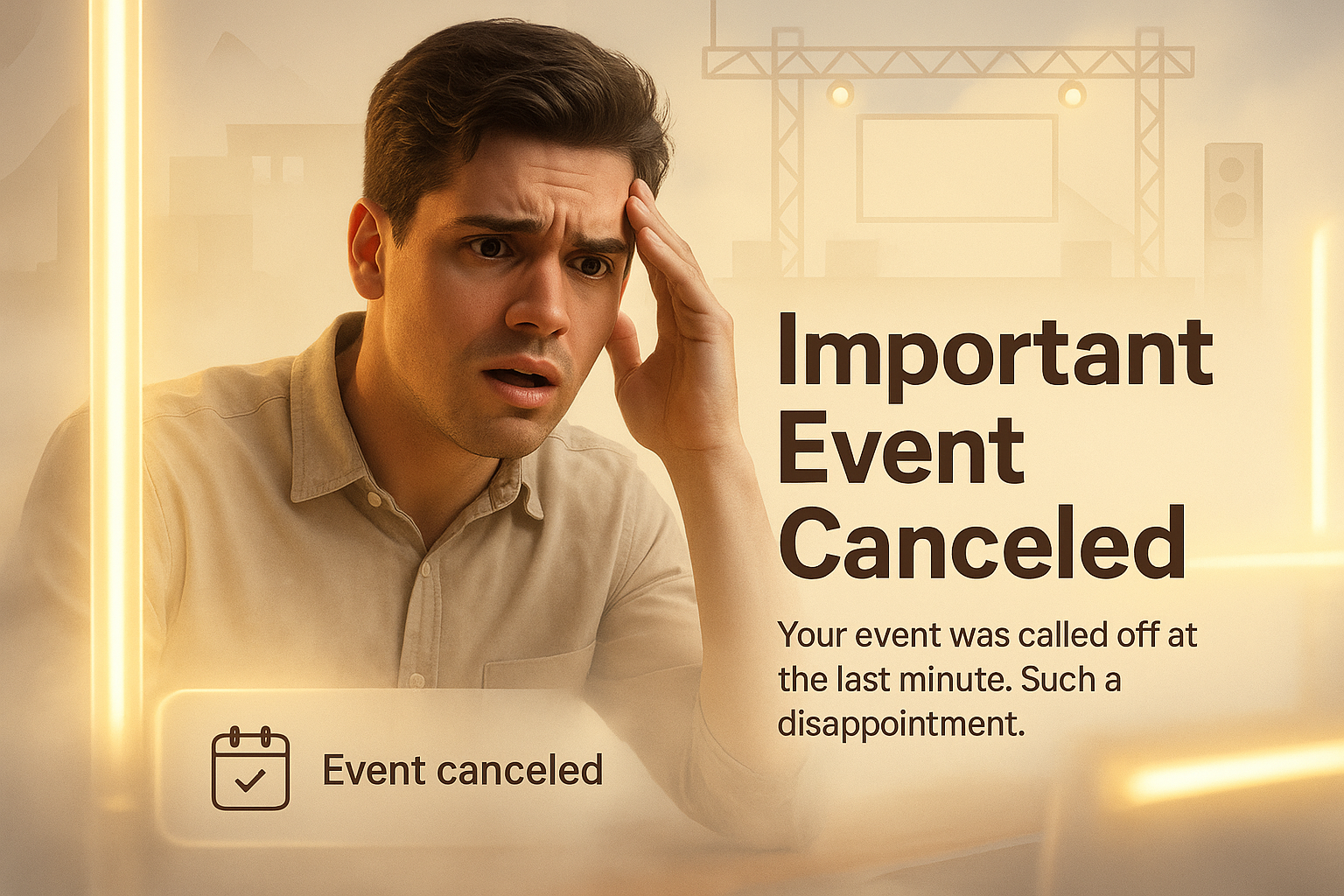 /Collection: /by davooda/Type: PNG/A digital announcement graphic illustrating the emotional impact of a canceled event. The design features a worried individual and modern typography, suitable for social media or email notifications.