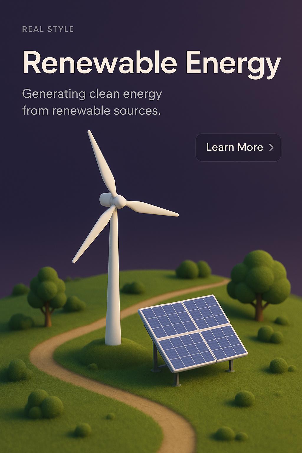 /Collection: /by davooda/Type: PNG/A visually appealing 3D illustration showcasing renewable energy sources, featuring a wind turbine and solar panels in a serene landscape. The dark gradient background enhances the vibrant colors of the scene.