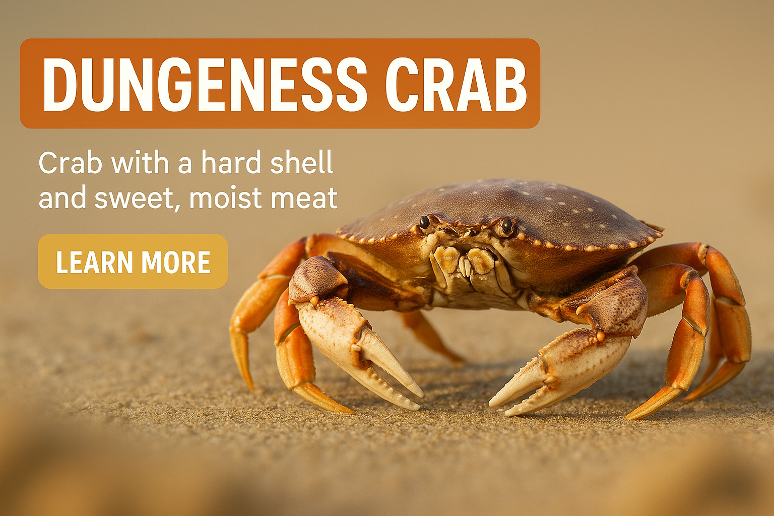 Close-up image of a Dungeness crab, highlighting its unique features with a clean, modern design. Ideal for seafood marketing or educational purposes.