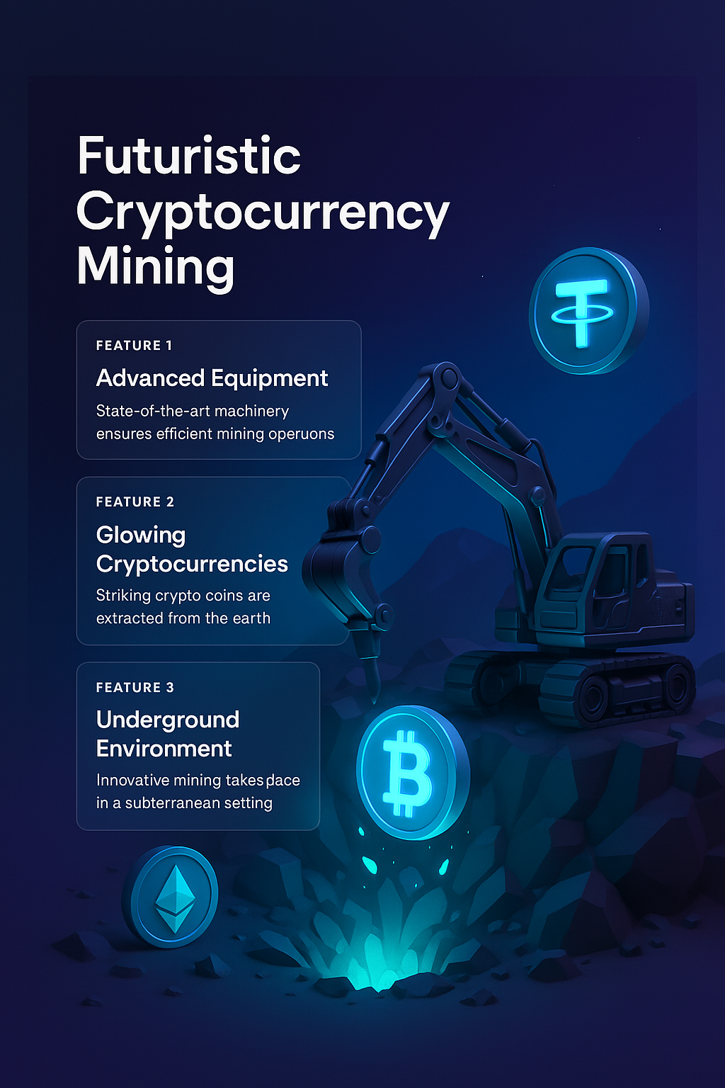 /Collection: /by davooda/Type: PNG/A visually stunning 3D illustration of a futuristic cryptocurrency mining scene featuring advanced equipment and glowing crypto coins, set against a deep gradient background.