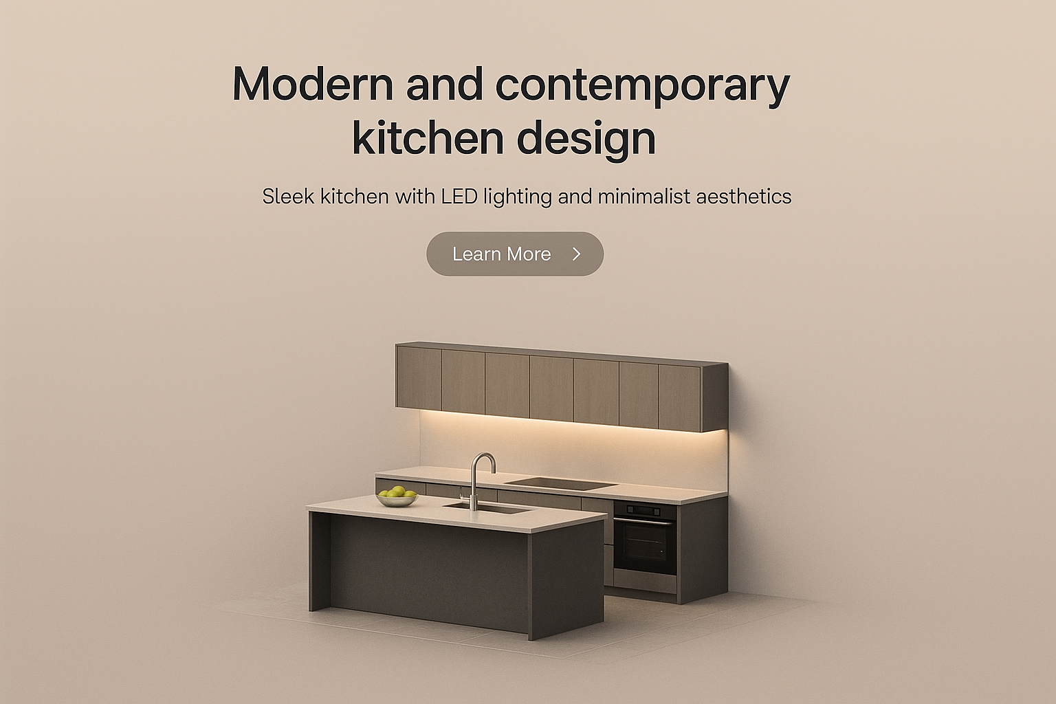 A contemporary kitchen design featuring LED lighting and a minimalist aesthetic. The scene captures a zoomed-out view, showcasing a sleek kitchen with a small label and call-to-action.